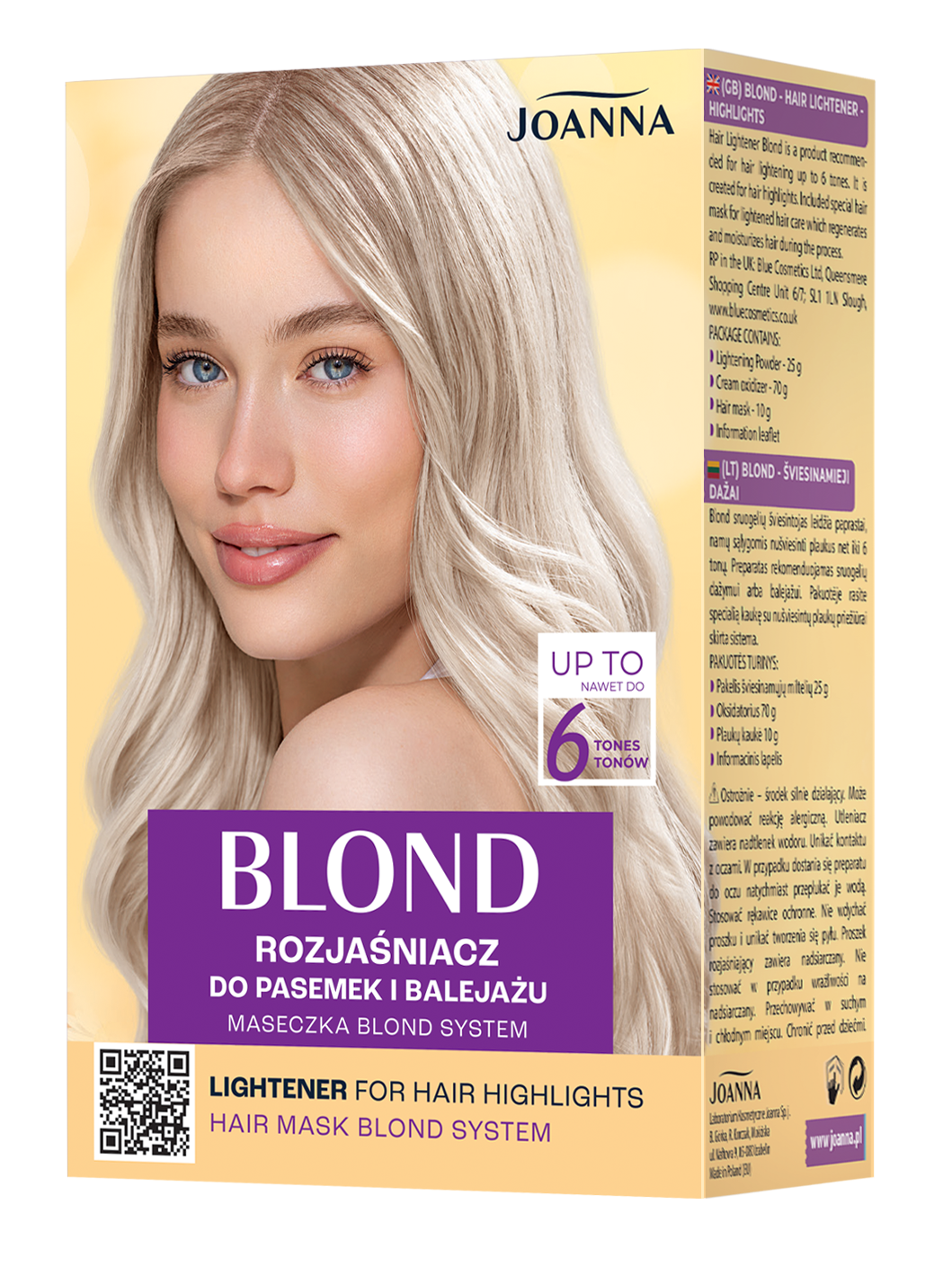 Rozjaśniacz Blond to produkt, który zyskał stałe grono zadowolonych oraz lojalnych Klientek. Aby wyjść naprzeciw ich oczekiwaniom opracowaliśmy jego ulepszoną formułę. Dzięki niej w warunkach domowych uzyskasz efekt rozjaśnienia włosów nawet do 6 tonów, a Twoje włosy zyskają modne, jasne odcienie blond i pełne blasku refleksy świetlne.